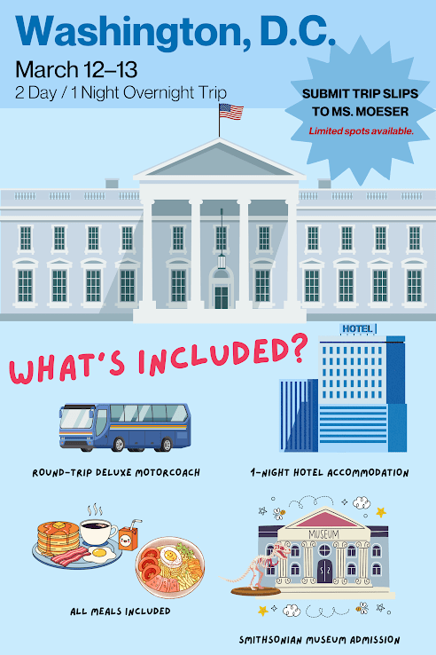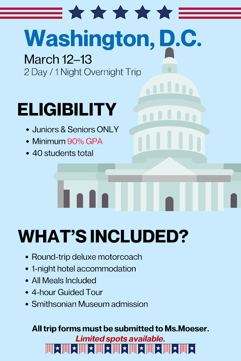 Stay tuned for our trip to Washington D.C. if your GPA is higher than a 90! Why stay home bored when you can go on a tour of D.C.?